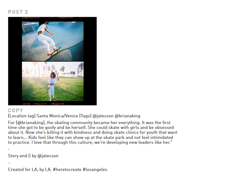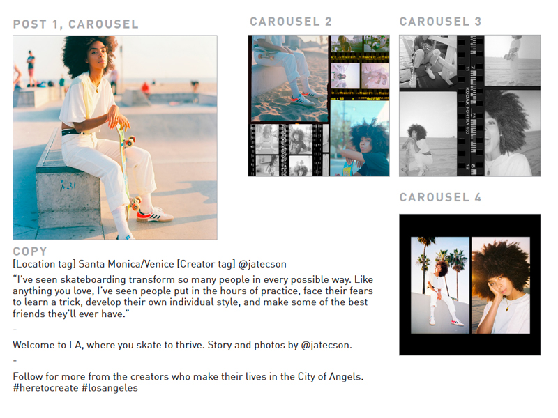 The Newsroom combined user research and coordinated with a set of influencers from around LA to create content from their respective neighborhoods. I worked with an account lead in North America Brand design to develop a posting strategy with copy and art direction for the launch of adidas LA social.